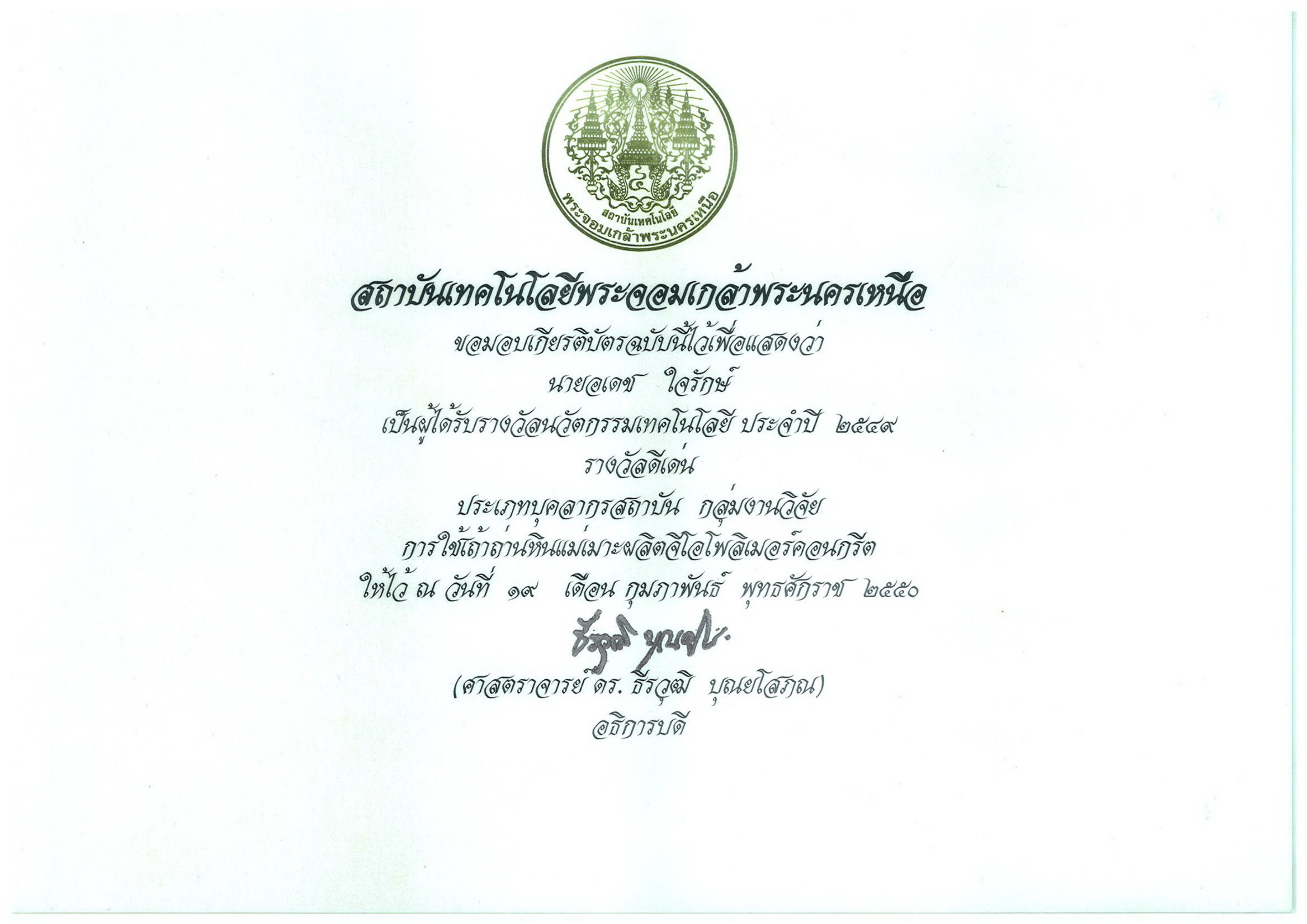 2 ความสำเร็จรางวัลนวัตกรรมเทคโนโลยี ประจำปี 2549 รางวัลดีเด่น มหาวิทยาลัยเทคโนโลยีพระจอมเกล้าพระนครเหนือ